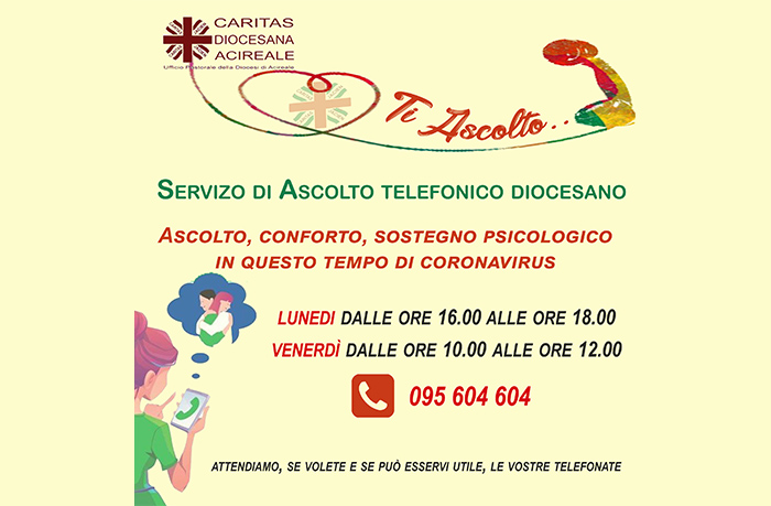 La Caritas diocesana, a nome del direttore don Orazio Tornabene, ha attivato un Servizio di Ascolto telefonico.  In questo recente periodo è aumentato il bisogno di parlare, essere ascoltati, raccontare, raccontarsi e superare la solitudine.