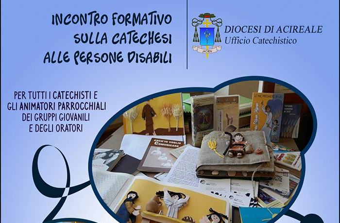 L’ufficio Catechistico della Diocesi di Acireale informa che giovedì 19 aprile 2018, dalle ore 17,00 alle ore 19,30, nei locali della Parrocchia Santi Cosma e Damiano di Acireale (via Prov. S. M. Ammalati, n. 143), si svolgerà l’INCONTRO FORMATIVO SULLA CATECHESI ALLE PERSONE DISABILI sul tema: “Ciò che le nostre mani hanno toccato… e i nostri occhi hanno veduto – una parola per tutti“.