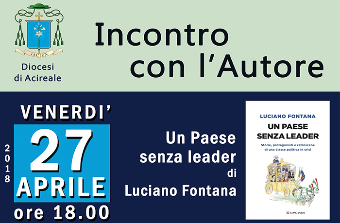 La Diocesi di Acireale organizza Venerdì 27 Aprile 2018 alle ore 18.00 nella Sala Conferenze del Credito Siciliano, in via Sclafani, 40 – Acireale una conversazione sul volume: ” Un Paese senza Leader – storie, protagonisti e retroscena di una classe politica in crisi” (Testo a cura di Luciano Fontana;  –  Longanesi editore). Alla conversazione sarà presente l’autore Luciano Fontana, direttore de “il Corriere della Sera”, che incontrerà il nostro Vescovo S.E.R Mons. Antonino Raspanti; moderatore dell’incontro sarà il giornalista Salvo Fallica.