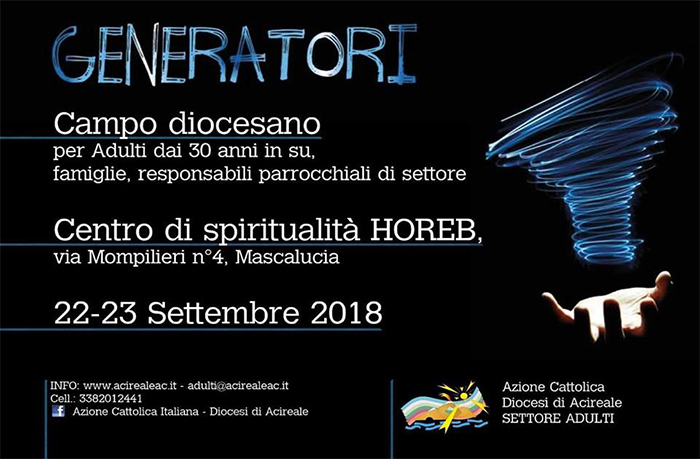 Sabato 22 e Domenica 23 settembre 2018 nel centro di spiritualità HOREB in via Mompilieri, 4 Mascalucia (Ct) l’Azione Cattolica italiana sez. di Acireale organizza il campo diocesano, dal tema GENERATORI.