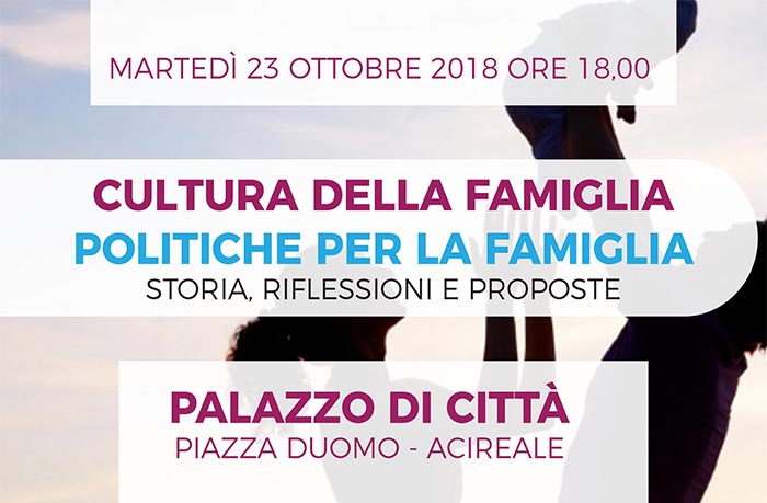 Martedì 23 ottobre 2018 alle ore 18.00 nel Palazzo di Città, sito in Piazza Duomo in Acireale, avrà luogo un incontro sul tema: “Cultura della Famiglia, Politiche per la Famiglia – Storia, riflessioni e proposte”