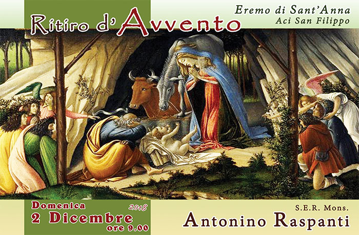Domenica 2 dicembre 2018, con inizio alle ore 9, nell’Eremo di Sant’Anna ad Aci San Filippo, S.E.R. monsignor Antonino Raspanti, vescovo della diocesi di Acireale, terrà il ritiro d’Avvento.