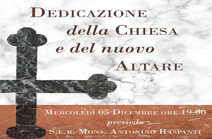 Mercoledì 5 dicembre 2018 alle ore 19.oo si terrà nella chiesa SS. Salvatore in Acireale la “Dedicazione della chiesa e del nuovo altare”.