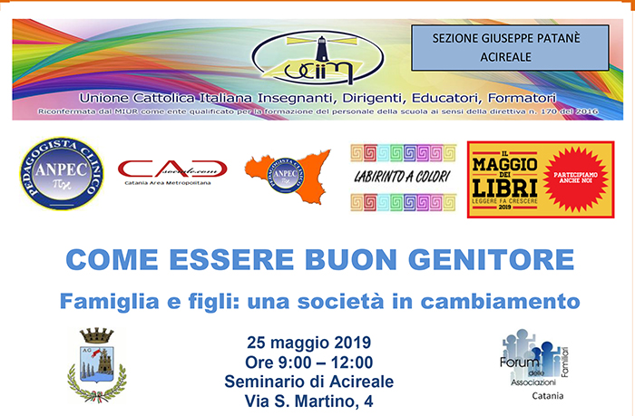 Sabato 25 maggio 2019, con inizio alle ore 9.00, nei locali del Seminario vescovile di Acireale, avrà luogo l’incontro sul tema: “Come essere buon genitore – famiglia e figli: una società in cambiamento”.