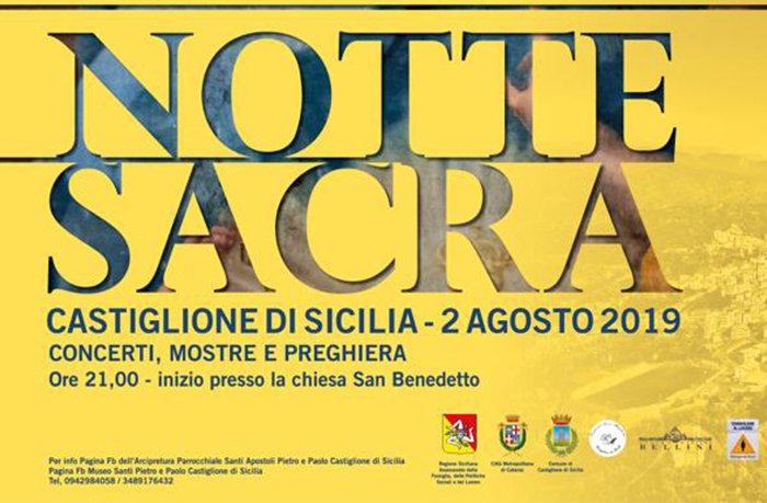Venerdì 2 agosto 2019 a partire dalle ore 21.00 avrà luogo, nella splendida città medievale di Castiglione di Sicilia, la”notte sacra” giunta alla seconda edizione, connubio tra sacralità, arte, musica e cultura .