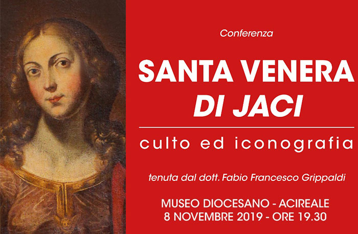 A conclusione della mostra iconografica su Santa Venera, che ha avuto inizio lo scorso luglio e avrà termine il 14 novembre, Venerdì 8 novembre 2019 avrà luogo nel Museo diocesano (Palazzo D’Amico, via mons. Genuardi 16, Acireale) una conferenza dal titolo “Santa Venera di Jaci, culto ed iconografia“, tenuta dal dott. Fabio Francesco Grippaldi.
