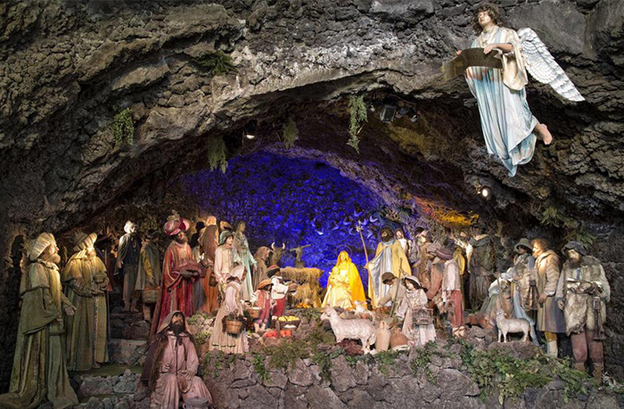 All’interno della chiesa di Santa Maria della Neve, in Acireale, i trentaquattro personaggi del presepe a grandezza naturale, tutti con volti in cera e mani in legno, aspettano i visitatori “na rutta”, una grotta di scorrimento lavico creatasi da un’antica eruzione dell’Etna.