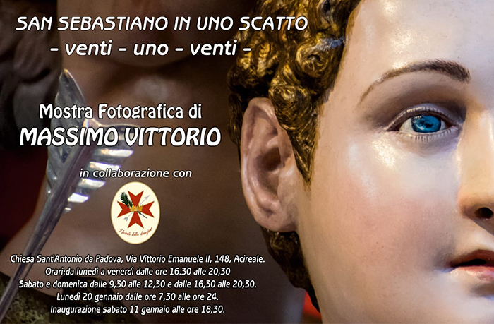 In occasione dei solenni festeggiamenti di San Sebastiano martire in Acireale, in collaborazione con i Fercoli della devozione, dall’11 al 20 gennaio 2020 sarà allestita la MOSTRA FOTOGRAFICA – San Sebastiano in uno scatto – nella chiesa di Sant’Antonio da Padova in Acireale (Via Vittorio Emanuele II,148)