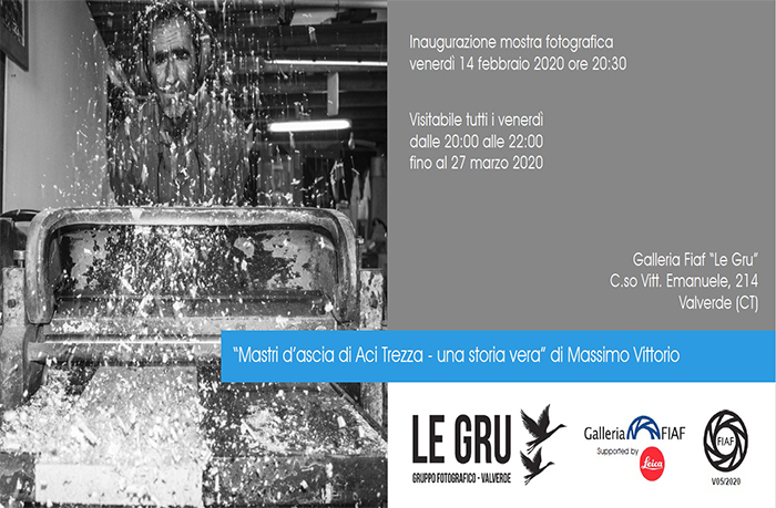 Venerdì 14 febbraio 2020 alle ore 20,30 sarà inaugurata la mostra fotografica personale di Massimo Vittorio dal titolo “Mastri d’ascia di Aci Trezza – una storia vera” presso la Galleria FIAF LE GRU (Corso Vittorio Emanuele, 214) di Valverde CT.