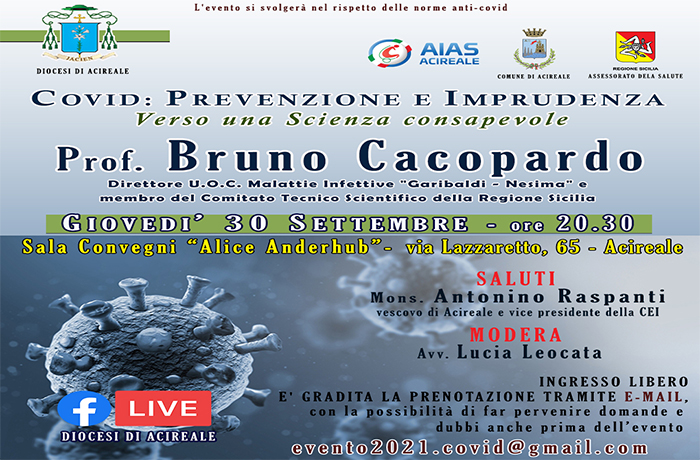 La Diocesi di Acireale, con il patrocinio del Comune di Acireale e della Regione Siciliana, e la disponibilità dell’A.I.A.S., organizza Giovedì 30 settembre 2021, alle ore 20.30, nella sala convegni Anderhub in via Lazzaretto 65, Acireale (sede A.I.A.S.)  un convegno dal titolo “PREVENZIONE E IMPRUDENZA. VERSO UNA SCIENZA CONSAPEVOLE”. Il relatore è il prof. Bruno Cacopardo, Direttore Malattie Infettive Garibaldi – Nesima e membro del Comitato Tecnico Scientifico della Regione Sicilia.