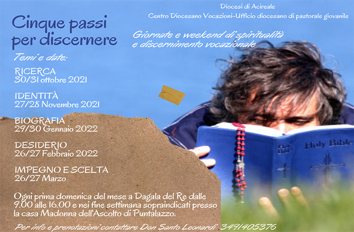 L’Ufficio per la Pastorale delle Vocazioni della diocesi di Acireale, guidato dal direttore don Santo Leonardi, in collaborazione con il Servizio per la Pastorale Giovanile, offre un servizio per sensibilizzare i fedeli in merito alla tematica vocazionale ed al discernimento attraverso una proposta di cammino fatto di tappe, che conduce in modo graduale e paziente alla comprensione del progetto e dell’agire di Dio.