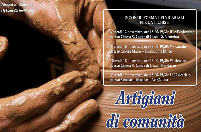 L’Ufficio Catechistico Diocesano, guidato dal direttore don Carmelo Sciuto, presenta un programma di incontri formativi vicariali per catechisti, accogliendo i suggerimenti del Documento “Artigiani di Comunità” elaborato dall’Ufficio Catechistico Nazionale (UCN) che offre le linee guida per la catechesi. Il cammino sinodale appena inaugurato, infatti, spinge la comunità diocesana a vivere questo tempo di grazia con la speranza e l’entusiasmo dell’evangelizzatore. E’ di notevole importanza riprendere la catechesi di iniziazione alla vita cristiana in parrocchia attraverso un dialogo con le famiglie e con i ragazzi.
