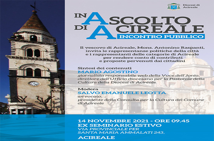 Il percorso “In Ascolto di Acireale” giunge al momento di pubblica sintesi finale, che avrà luogo domenica 14 novembre 2021 come da volontà del vescovo, monsignor Raspanti, nei locali dell’ex Seminario estivo di via provinciale per Santa Maria Ammalati 243, ad Acireale, a partire dalle 9.45. Modera l’Avv. Salvo Emanuele Leotta, Avvocato e Presidente della Consulta per la Cultura del Comune di Acireale.