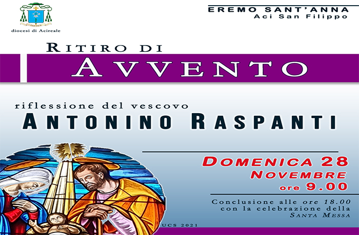 Domenica 28 novembre 2021, nell’Eremo di Sant’Anna ad Aci San Filippo, monsignor Antonino Raspanti, vescovo della diocesi di Acireale, terrà il ritiro d’Avvento, tempo liturgico che precede e prepara al Santo Natale. Il momento di particolare importanza spirituale è aperto a tutti. La preghiera delle lodi alle ore 9.00 darà inizio alla giornata che si concluderà alle ore 18.00 con la celebrazione della Santa Messa.
