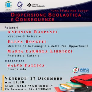Venerdì 17 dicembre 2021, alle ore 17.30, avrà luogo ad Acireale nella sala conferenze dell’AIAS (Via Lazzaretto, 65) l’incontro pubblico su “Dispersione Scolastica e Conseguenze. Una sfida per tutti”.
