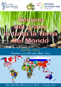 Il 24 settembre, nell’ambito del progetto “SeminiAmo il futuro” curato dai ragazzi dell’Oratorio di San Filippo Neri (S. Nicolò di Aci Catena), si è lanciata pubblicamente l’idea semplice, ma allo stesso tempo ambiziosa, di “seminare il grano in tutta la terra del mondo”. Domenica 12 dicembre dopo la Santa Messa delle ore 10,30, in uno spazio attiguo alla chiesa della Divina Misericordia di San Nicolò, i bambini e i ragazzi dell’Oratorio San Filippo Neri saranno impegnati nell’attività di semina. Si è quindi voluto raccogliere l’invito di Papa Francesco di “prenderci cura della nostra Madre Terra” perchè se curata e rispettata è capace di produrre vita e ricchezza per tutti. Tutti hanno la responsabilità nei confronti della “casa comune”.