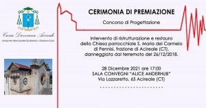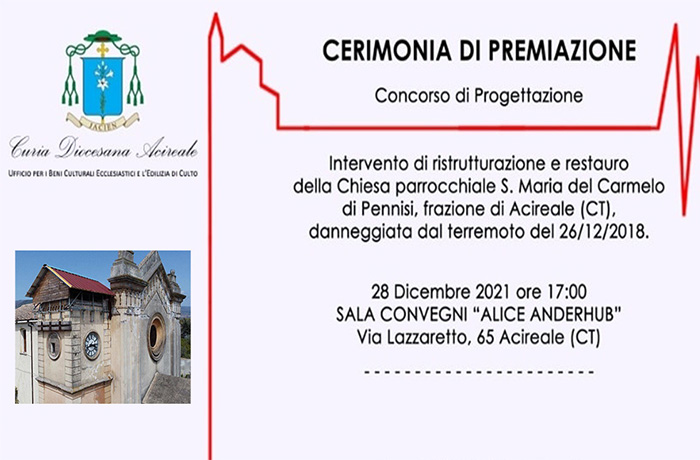 Martedì 28 Dicembre, alle ore 17.00, nella  SALA CONVEGNI “ALICE ANDERHUB” dell’AIAS – Via Lazzaretto, 65 Acireale – si svolgerà la CERIMONIA DI PREMIAZIONE del Concorso di Progettazione per l’Intervento di ristrutturazione e restauro della chiesa parrocchiale S. Maria del Carmelo di Pennisi, frazione di Acireale (CT), danneggiata dal terremoto del 26/12/2018. Aprirà e concluderà i lavori mons. Antonino Raspanti, vescovo di Acireale.