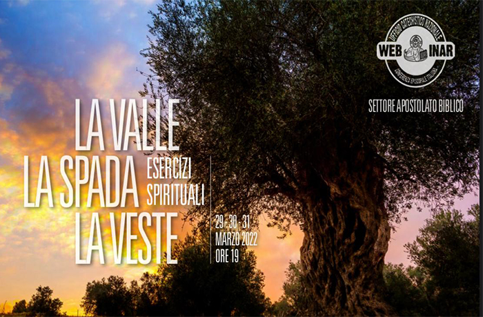 L’Ufficio Catechistico Nazionale, in preparazione alla Santa Pasqua, invita a partecipare agli esercizi spirituali che si svolgeranno in modalità on line nei giorni 29-30-31 marzo 2022, dalle ore 19.00 alle ore 19.30. Il tema sarà: La valle, la spada e la veste.