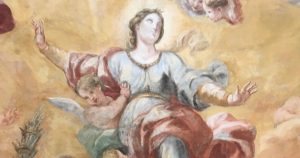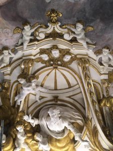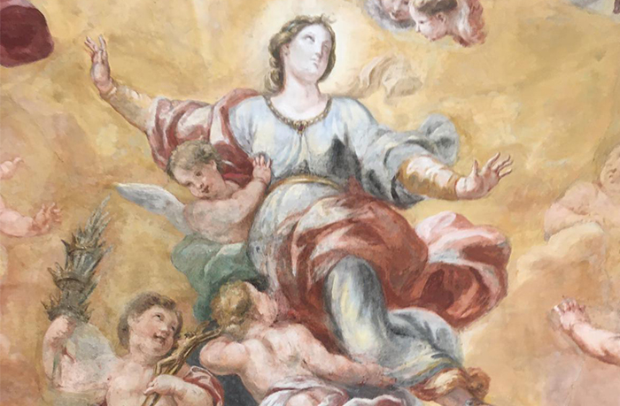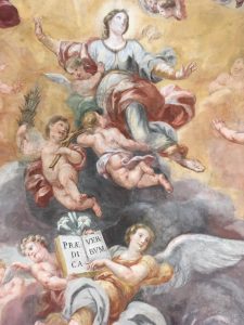 Il suo volto radioso prelude già la visione celeste alla quale la indirizza l’angelo. Ecco allora aprirsi idealmente la volta del cielo dov’è la martire è accolta dal Padre insieme ad un tripudio di cori angelici che fanno festa in suo onore. Venera è testimoni di Cristo non sono con la predicazione (PRAEDICA VERBUM – predica la Parola – leggiamo nel libro tenuto da un angelo), ma anche con il dono della sua vita.