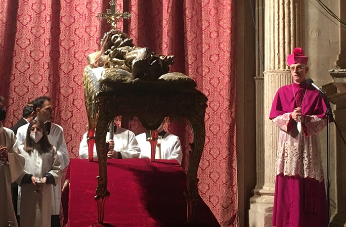 Siamo un’unica famiglia solo quando ci riconosciamo tutti figli di un solo Padre e questa morte è stata una morte per evitare le divisioni e ricostituire l’unità di tutta la famiglia umana, dunque anche delle nostre famiglie, di questa città, dei bambini, degli anziani, di chi è solo, di chi non ha potuto piangere a dovere chi è morto di pandemia, chi ha salutato il proprio caro, la propria cara andata in ospedale e non l’ha più rivista. Tanti di noi hanno sofferto questo distacco ingrato: che il sangue di Cristo e le lacrime di Maria possano consolare i nostri cuori e i cuori di tutti gli uomini.