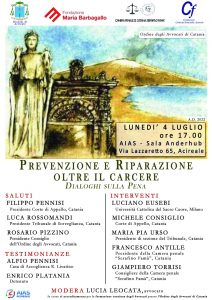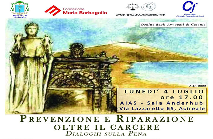 La Diocesi di Acireale e l’Ordine degli Avvocati di Catania, in collaborazione con le Fondazioni Città del Fanciullo e Maria Barbagallo, e la Camera Penale di Catania “Serafino Famà”  organizzano un incontro dal titolo PREVENZIONE E RIPARAZIONE OLTRE IL CARCERE, DIALOGHI SULLA PENA. L’importante convegno si svolgerà LUNEDI’ 4 LUGLIO alle ore 17 nella SALA ANDERHUB dell’AIAS, sita in via Lazzaretto 65, Acireale. Sarà presente mons. Antonino Raspanti, vescovo di Acireale.