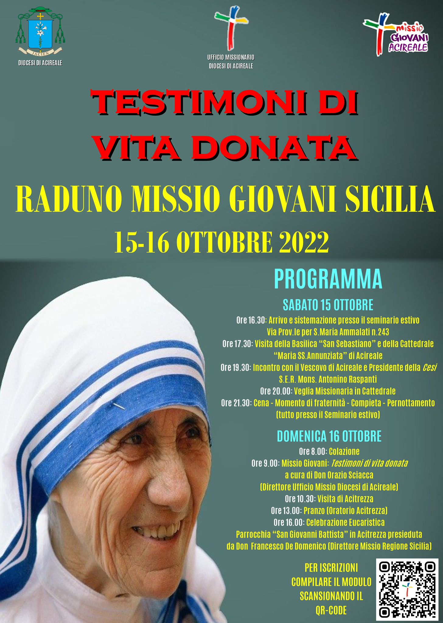 Inoltre, quest’anno la diocesi di Acireale è stata scelta come sede per il RADUNO MISSIO GIOVANI DI SICILIA che si svolgerà sabato 15 e domenica 16 ottobre. Chi desidera iscriversi, scannerizzi il QR-CODE sulla locandina o acceda al seguente link: https://forms.gle/MdUcXKTHFpwFuHSZ6 .