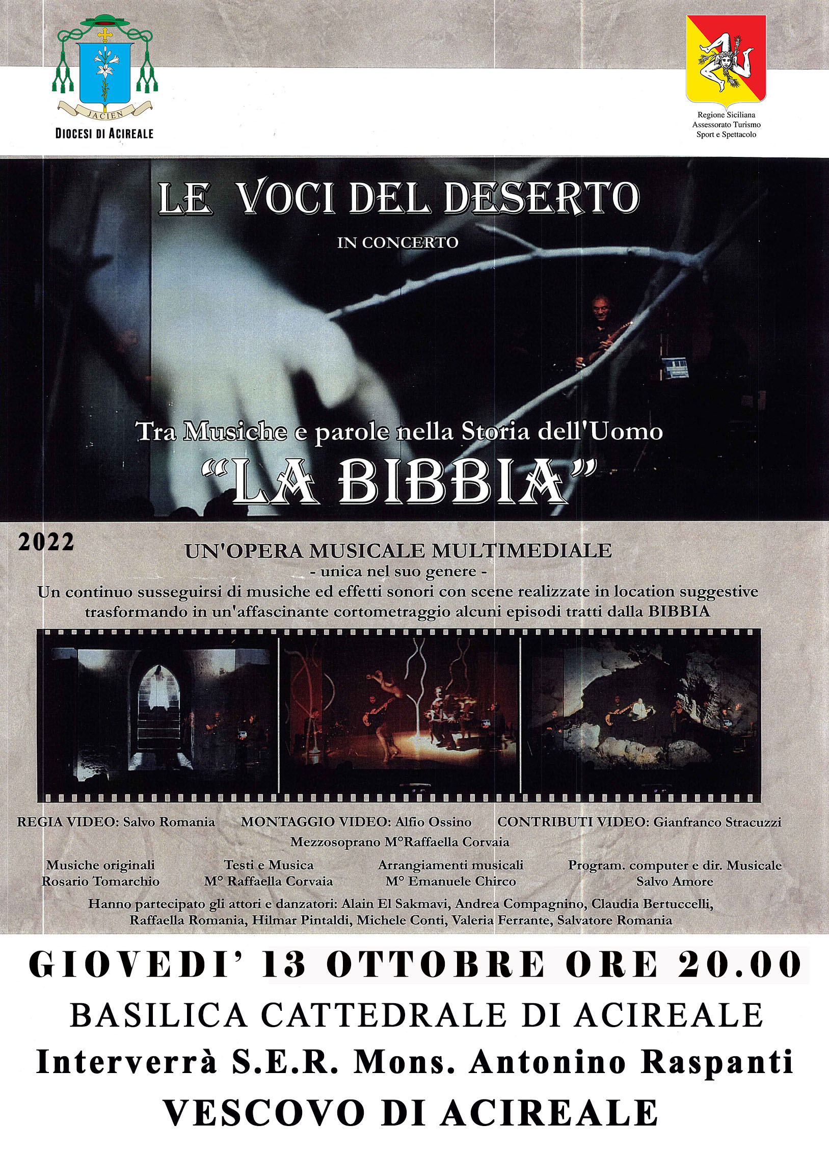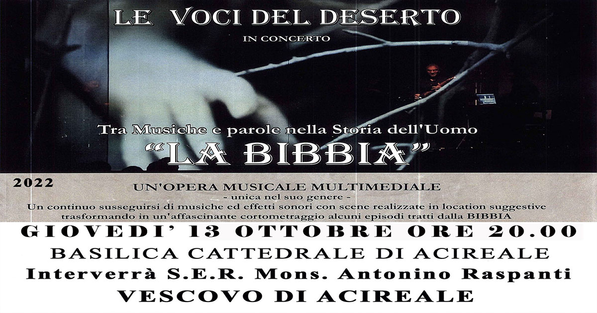 Giovedì 13 ottobre alle ore 20.00 avrà luogo nella Basilica Cattedrale uno spettacolo unico nel suo genere: L A B I B B I A – Tra Musiche e Parole nella Storia dell’uomo. L’evento, patrocinato dalla Regione Siciliana, è stato realizzato ed ideato dalla formazione artistica “Le Voci del Deserto”. La multimedialità musicale dell’Opera mette in scena una rappresentazione suggestiva ed emozionale. Sarà presente mons. Antonino Raspanti, vescovo di Acireale.