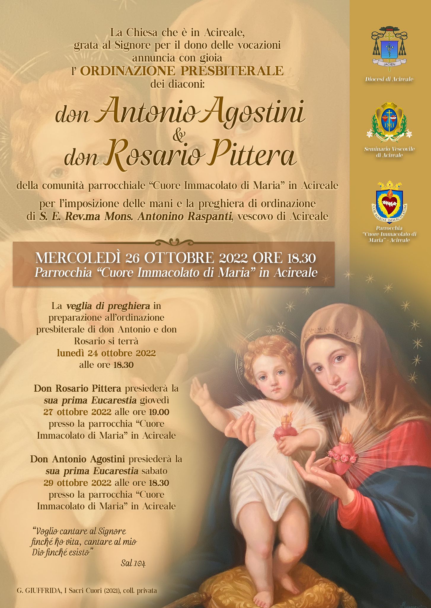 La Diocesi di Acireale e il Seminario Vescovile, guidato dal rettore mons. Giovanni Mammino, unitamente alle famiglie, annunciano con gioia che mercoledì 26 ottobre 2022 alle ore 18.30, nella parrocchia “Cuore Immacolato di Maria” (Acireale) saranno ordinati presbiteri per l’imposizione delle mani e la preghiera di ordinazione di Mons. Antonino Raspanti, vescovo della diocesi Acireale, i diaconi: