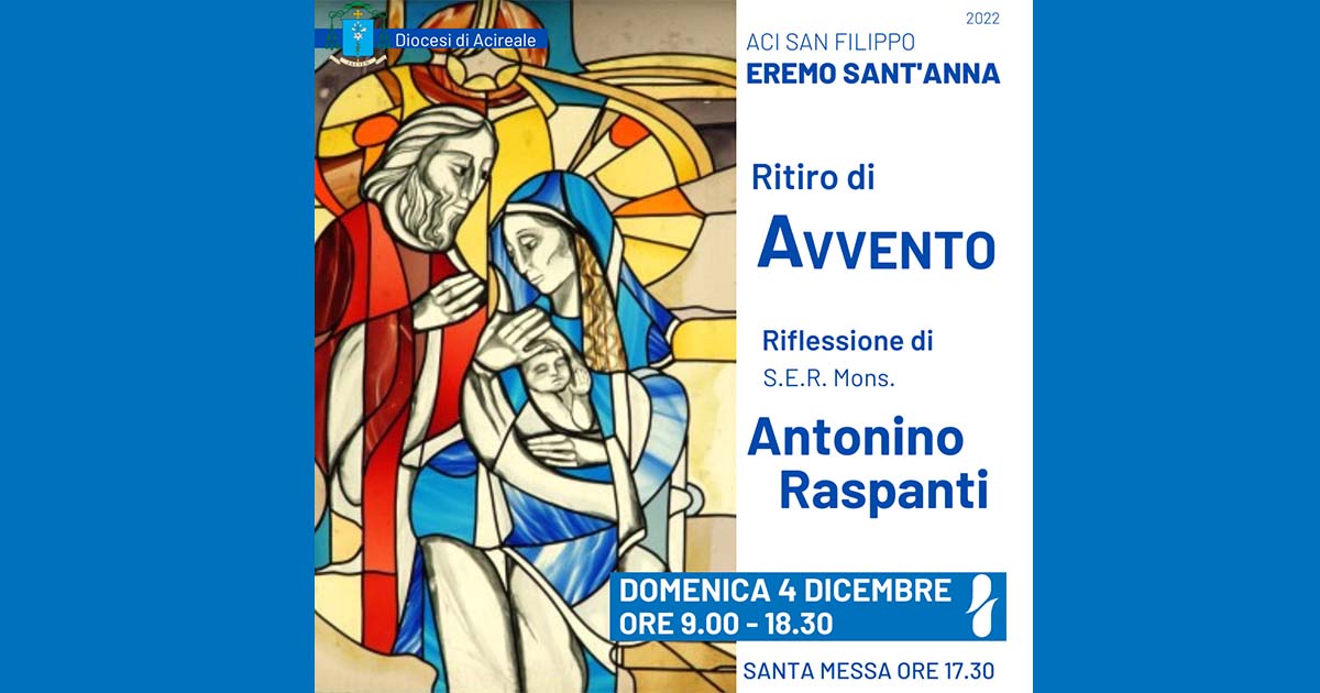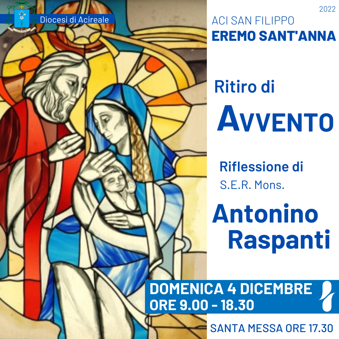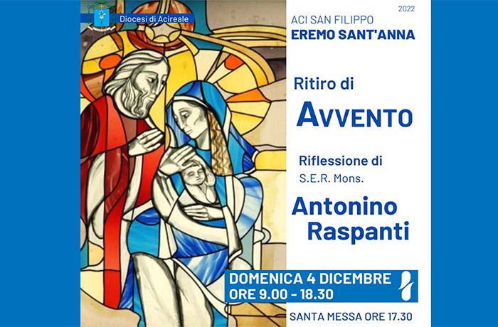 Domenica 4 dicembre 2022, all’Eremo di Sant’Anna (Aci San Filippo), S.E.R. mons. Antonino Raspanti, vescovo della diocesi di Acireale, terrà il ritiro d’Avvento, tempo liturgico che precede e prepara il Santo Natale.