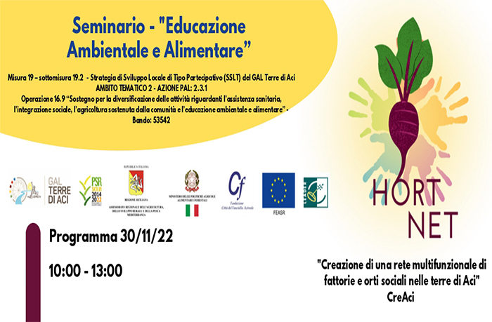 Hortnet risponde all’Azione di Sensibilizzazione e coinvolgimento della cittadinanza secondo gli obiettivi del progetto “CreAci – Per la Creazione di una rete multifunzionale di fattorie e orti sociali nelle terre di Aci”– relativo al Bando Pubblico PSR Sicilia 2014-2020 Strategia di Sviluppo Locale di tipo Partecipativo “Terre di Aci” SOTTOMISURA 16.9 “Sostegno per la diversificazione delle attività riguardanti l’assistenza sanitaria, l’integrazione sociale, l’agricoltura sostenuta dalla comunità e l’educazione ambientale e alimentare” – ATS denominata: HortNet – CUP (Codice Unico Progetto): H41B21007310009”.