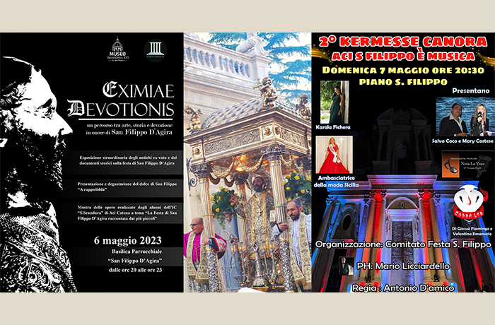 Inoltre, domenica 7 maggio, alle ore 20.30 a Piano San Filippo, il comitato dei festeggiamenti organizza la 2° Kermesse Canora “ACI SAN FILIPPO E’ MUSICA”, in onore del Santo Patrono Filippo di Agira in ricordo dell’imprenditore Salvatore Guarrera, venuto a mancare due anni fa.