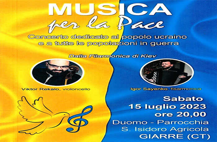 La sinfonia delle note musicali può far tacere il rumore delle bombe. Nella Chiesa Madre di Giarre, S. Isidoro Agricola, avrà luogo sabato 15 luglio alle ore 20 un concerto dedicato al popolo ucraino e a tutte le popolazioni in guerra. Dal gruppo “Filarmonica per Kiev”,  Viktor Rekalo, al violoncello, e Igor Sayenko, alla fisarmonica, entrambi concertisti ucraini, suoneranno “Musica per la Pace”.
