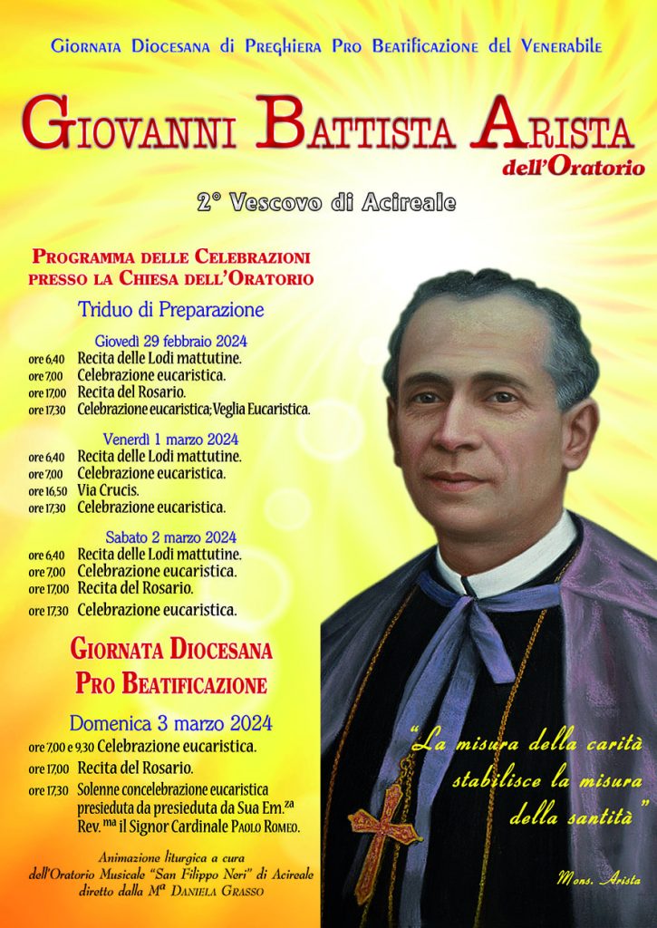 Domenica 3 marzo (III Domenica di Quaresima) ricorre la GIORNATA DIOCESANA PRO BEATIFICAZIONE DEL VENERABILE GIOVANNI BATTISTA ARISTA D.O., 2° Vescovo della Diocesi di Acireale (1907-1920). Alle ore 17.30 nella chiesa dell’Oratorio sarà celebrata una solenne Messa presieduta dal Cardinale Paolo Romeo, arcivescovo emerito di Palermo.