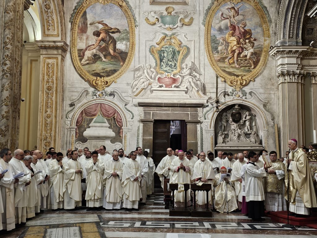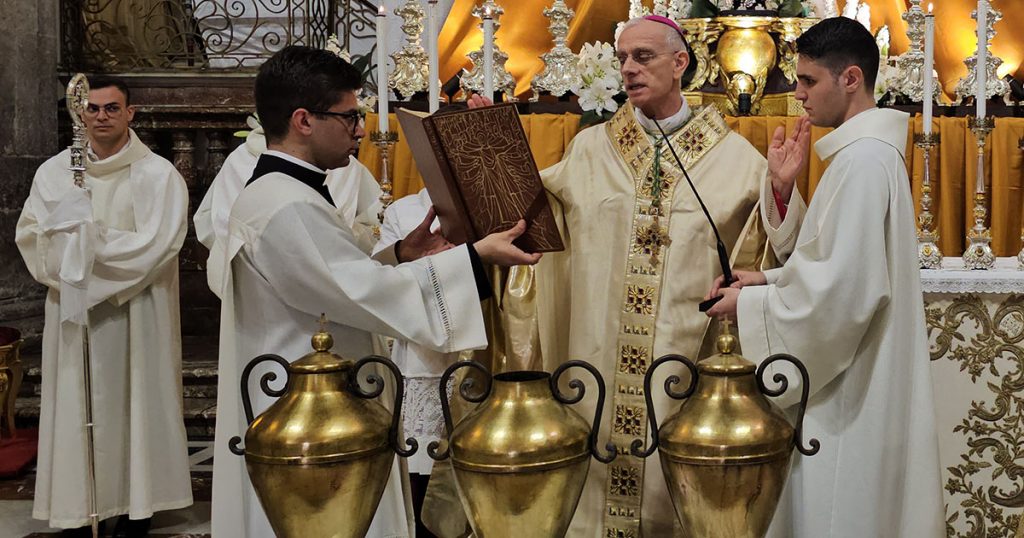 “Riflessioni sulla Pace: la Luce di Cristo nel buio delle guerre” è il messaggio che mons. Antonino Raspanti, vescovo di Acireale e presidente della Conferenza Episcopale Siciliana (Cesi), ha rivolto a fedeli, diaconi, presbiteri ed ecclesiastici in occasione della Messa Crismale celebrata in Cattedrale la mattina del 28 Marzo, giovedì santo.  In questa Celebrazione Eucaristica anche la benedizione degli oli ed il rinnovo delle promesse sacerdotali.