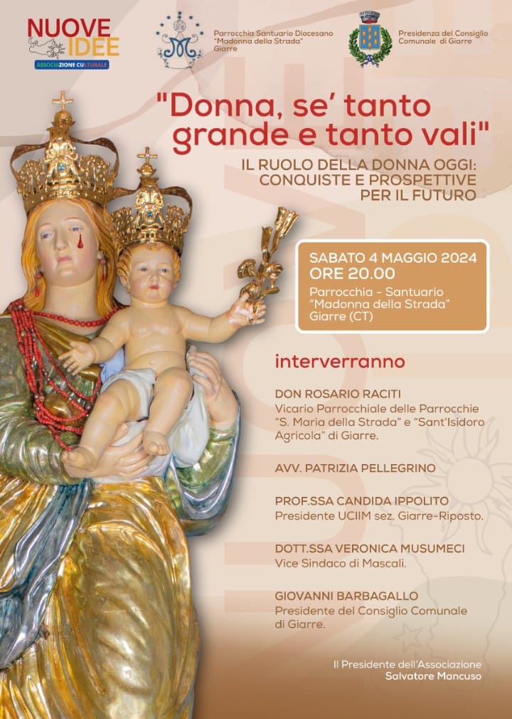In occasione dei solenni festeggiamenti in onore di Maria SS. della Strada in Giarre, che culmineranno domenica 12 maggio, la comunità del Santuario di Giarre annuncia l’organizzazione di un convegno intitolato “Il Ruolo della Donna Oggi: Conquiste e Prospettive per il Futuro”.