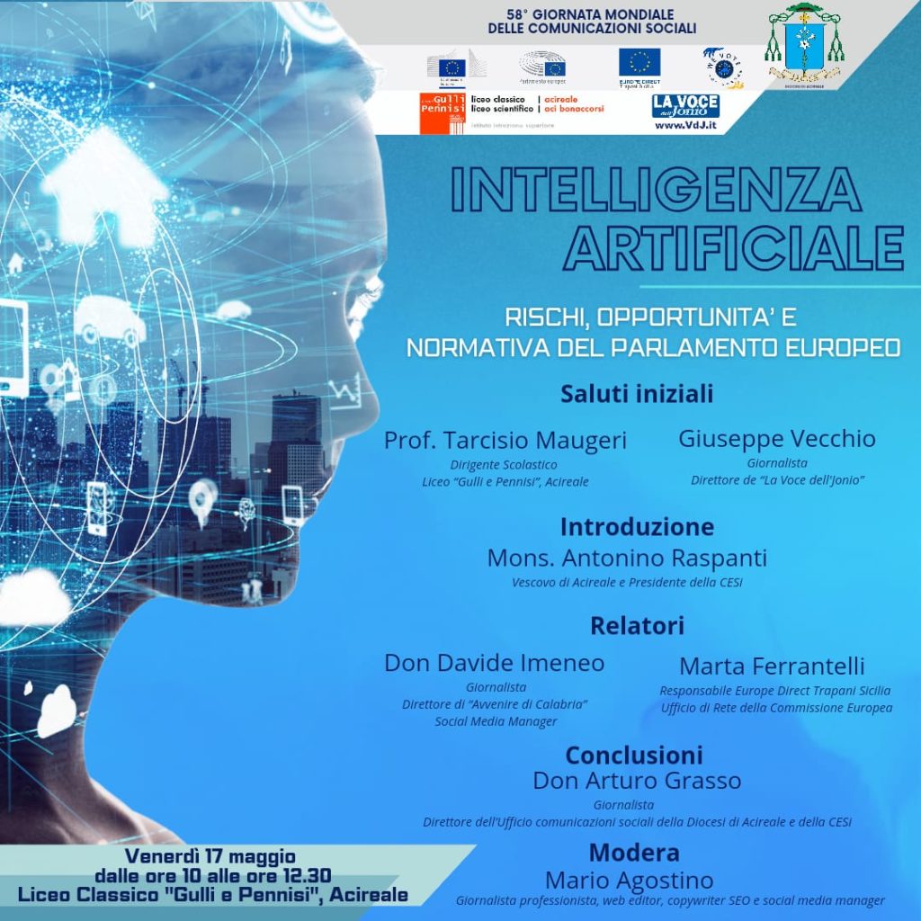 Nella Settimana delle Comunicazioni Sociali la Diocesi di Acireale organizza, venerdì 17 maggio, a partire dalle ore 10.00 presso l’Istituto acese “Gulli e Pennisi”, il convegno su “Intelligenza artificiale: rischi, opportunità e normativa del Parlamento Europeo”.