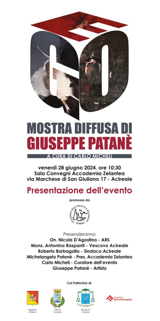 Venerdì 28 giugno 2024 alle ore 10.30 nella sede dell’Accademia Zelantea di Acireale si terrà la conferenza stampa di presentazione della mostra diffusa Ego di Giuseppe Patanè a cura di Carlo Micheli.