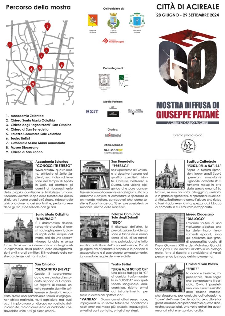 Il percorso espositivo è stato ideato per essere declinato in 9 locations – Palazzo Comunale Sala Zelantea, Chiesa di San Benedetto, Chiesa di San Rocco, Teatro Bellini, Chiesa degli “agonizzanti” San Crispino, Chiesa di Santa Maria Odigitria, Museo Diocesano, Accademia Zelantea, Cattedrale Ss.ma Maria Annunziata – dove il concetto di EGO e tutte le desinenze ad esso riferite vengono analizzate attraverso i lavori di Giuseppe Patanè.