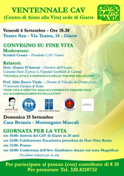 Per questa occasione il Centro di Aiuto alla Vita di Giarre organizza due eventi: venerdì 6 settembre, alle ore 18.30, un convegno sul “Fine Vita” al Teatro Rex di Giarre e domenica 15 settembre la “Giornata per la Vita”, nella struttura “Casa Betania” a Montargano di Mascali.