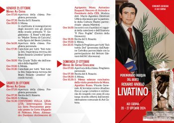 Dal 20 al 27 ottobre 2024 la città di Aci Catena e le sue frazioni celebreranno il beato Rosario Angelo Livatino nei diversi appuntamenti a carattere religioso e civile.
