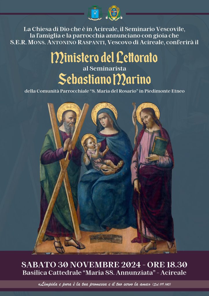 La Comunità del Seminario vescovile di Acireale e la Chiesa diocesana annunciano il conferimento del ministero del Lettorato al seminarista Sebastiano Marino, della parrocchia “Santa Maria del Rosario” in Piedimonte Etneo.