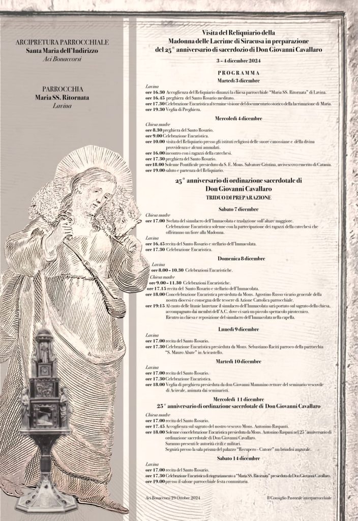La parrocchia Maria dell’Indirizzo di Aci Bonaccorsi e la Parrocchia Maria SS. Ritornata a Lavina si preparano ad accogliere il Reliquiario della Madonna delle Lacrime di Siracusa, che farà tappa nelle due comunità il 3 e 4 dicembre. Questo momento di preghiera e devozione si inserisce nelle celebrazioni per il 25° anniversario di sacerdozio del parroco don Giovanni Cavallaro.