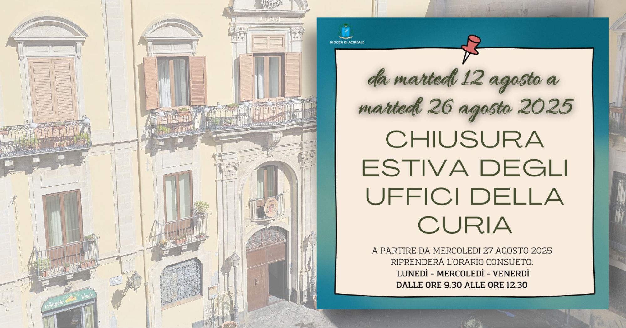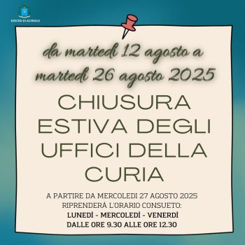 La diocesi di Acireale informa che gli Uffici della Curia diocesana (Largo Papa Giovanni XXIII, 3, Acireale) saranno chiusi da martedì 12 agosto a martedì 26 agosto 2025.