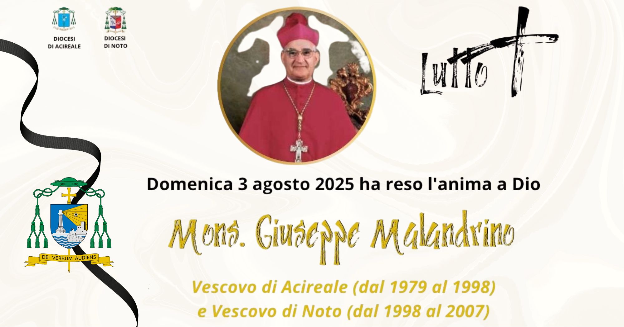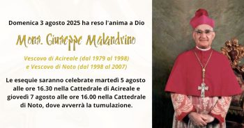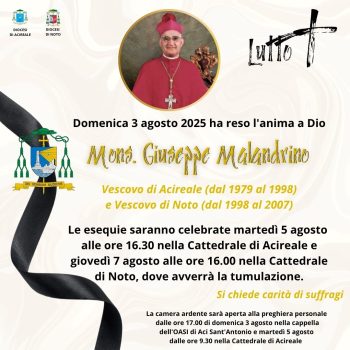 “Con animo grato al Signore, accompagniamo nella preghiera Mons. Giuseppe Malandrino, che ha guidato con sapienza, umiltà e dedizione la nostra Chiesa di Acireale e successivamente quella di Noto. Instancabile annunciatore della Parola, ha lasciato una testimonianza profonda di ascolto, di comunione e di amore per il popolo di Dio e per i sacerdoti. Ne ricordiamo l’umanità schietta, la coerenza evangelica e il grande rispetto per le persone. Invochiamo per lui la ricompensa promessa ai servi fedeli e la luce eterna del Risorto.”