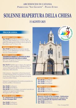 La Comunità Parrocchiale di Pisano, appartenente all’Arcidiocesi di Catania, annuncia con gioia la riapertura al culto della chiesa di San Giuseppe, evento che si terrà venerdì 15 agosto 2025 alle ore 10.30 alla presenza dell’Arcivescovo mons. Luigi Renna, e del parroco emerito della comunità, don Giuseppe Meli. Alla cerimonia prenderanno parte le autorità religiose e civili insieme alla comunità dei fedeli.