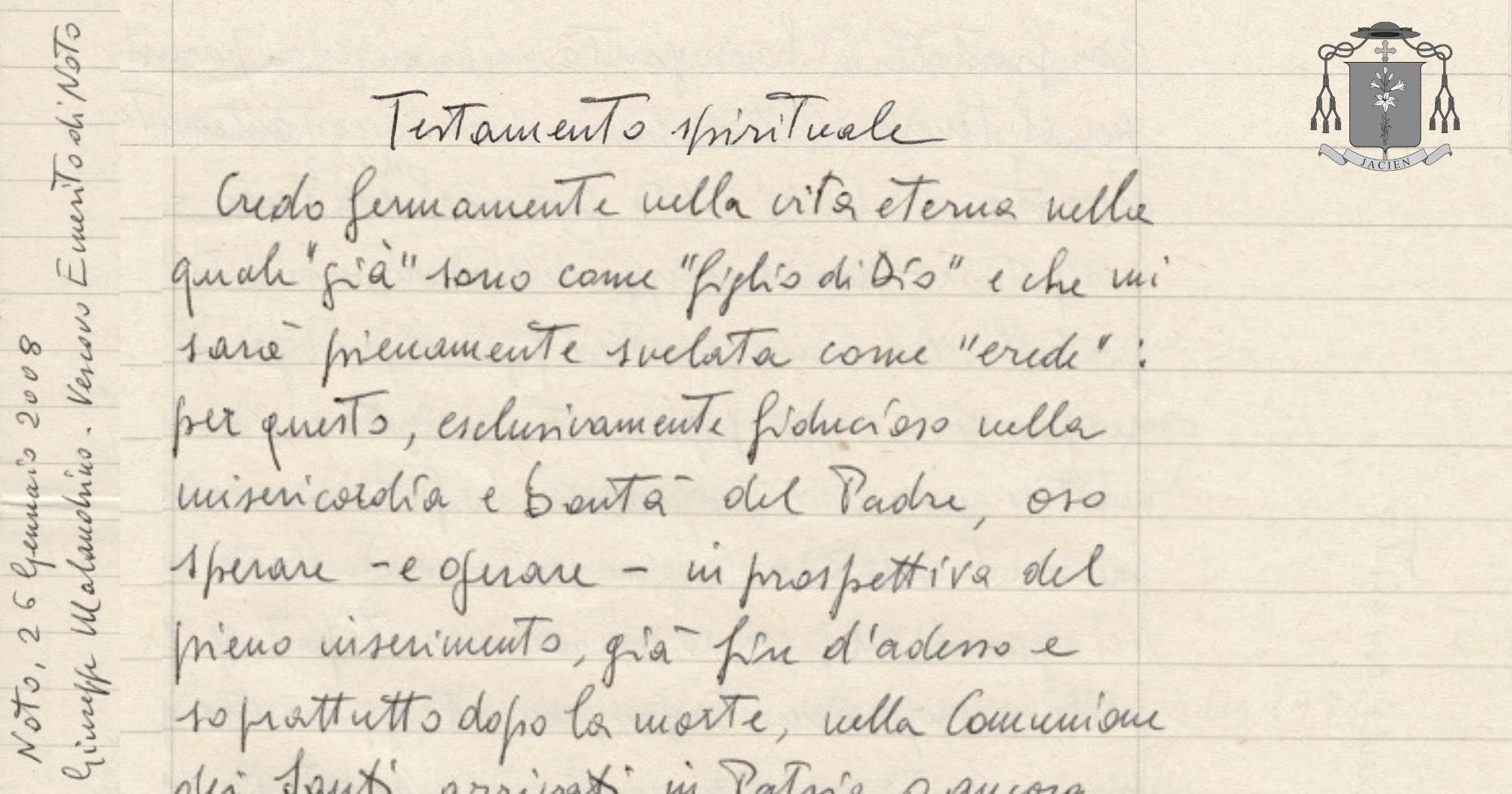 Pubblichiamo integralmente il testamento spirituale di Giuseppe Malandrino, Vescovo di Acireale (dal 1979 al 1998) e Vescovo di Noto (dal 1998 al 2007), che ha reso l’anima a Dio nella mattinata di domenica 3 agosto 2025.