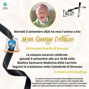 Le esequie saranno celebrate giovedì 4 settembre alle ore 16.00 nella Basilica Santuario Madonna delle Lacrime. Seguirà la traslazione nella Cattedrale di Siracusa.