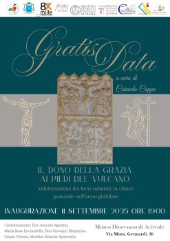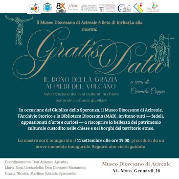 In occasione del Giubileo della Speranza, la Diocesi di Acireale annuncia l’apertura della mostra “Gratis Data, il dono della Grazia ai piedi del Vulcano”, che sarà inaugurata giovedì 11 settembre alle ore 19.00 al Museo Diocesano di Acireale, sito in Via Genuardi 16.