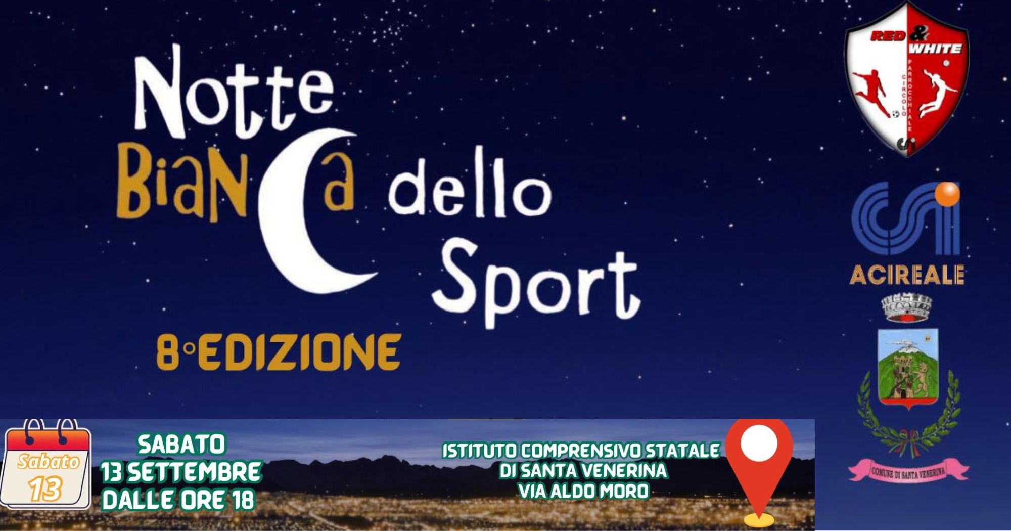 Santa Venerina si prepara a vivere la sua ottava edizione della Notte Bianca dello Sport, promossa dalla ASD Circolo Parrocchiale Red And White, affiliata al Comitato CSI di Acireale, con il patrocinio del Comune di Santa Venerina.