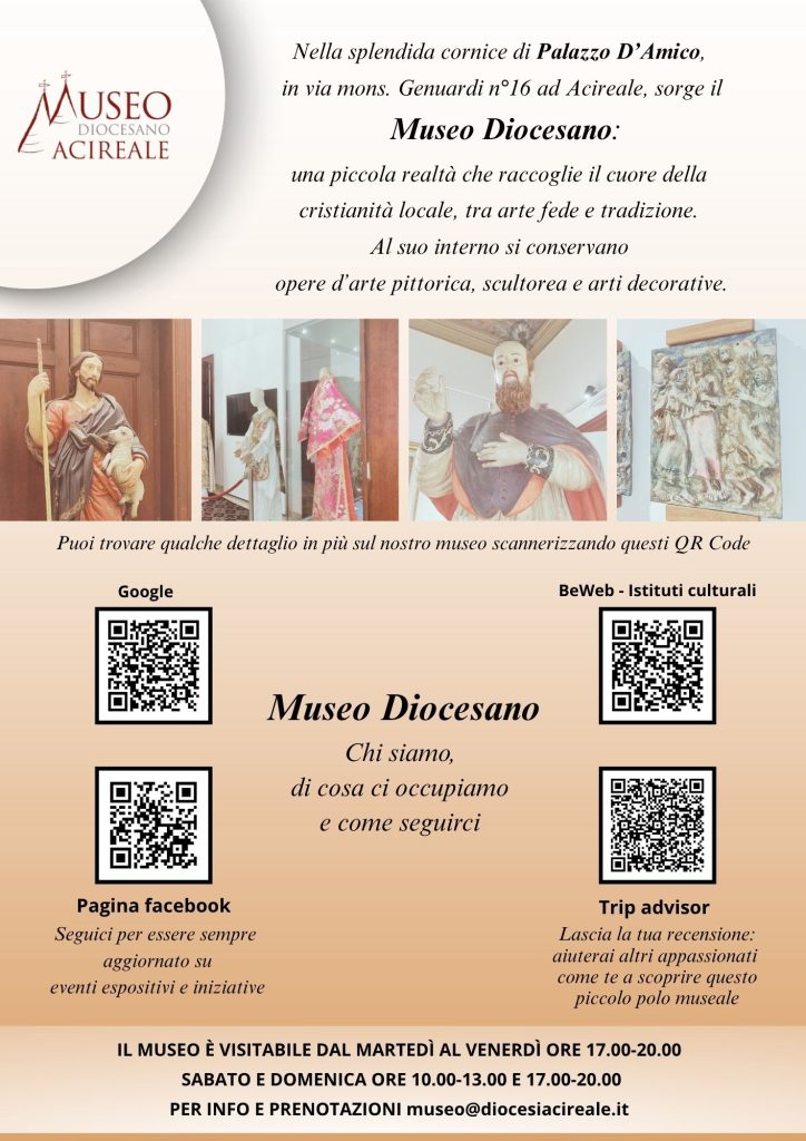 Ospitato nelle sale di palazzo D’Amico, edificio in stile liberty italiano alle spalle della Cattedrale di Acireale, il museo è uno scrigno prezioso di arte sacra e memoria storica. Voluto per valorizzare e custodire il ricco patrimonio artistico della Diocesi, oggi a dirigere il museo è don Antonio Agostini, docente di storia dell’arte moderna all’Università degli Studi di Catania.